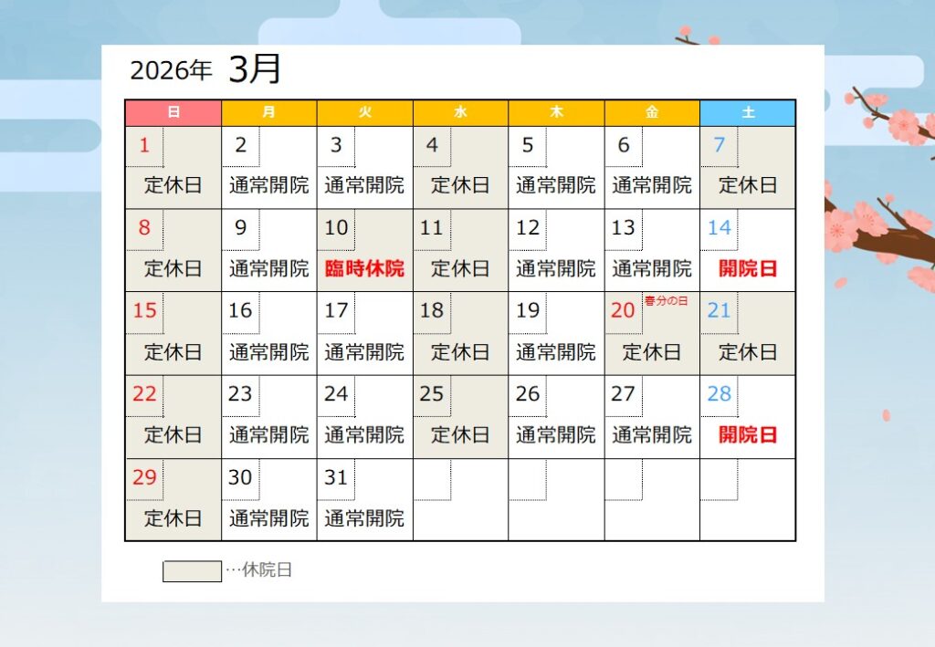 2026年3月開院カレンダーです